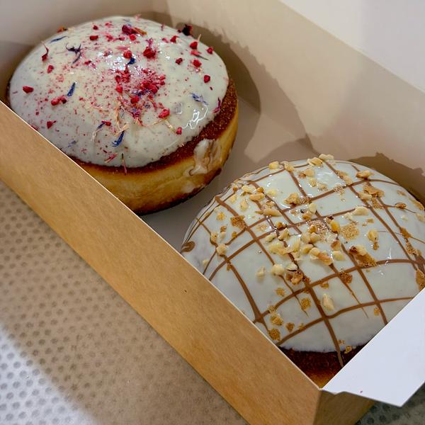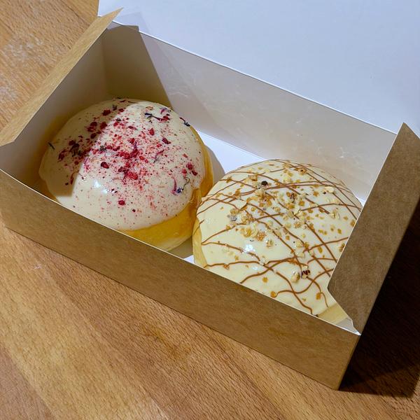 Pączek z kremem na bazie mlecznej czekolady i pasty z orzecha laskowego, kruszone orzechy laskowe ; pączek z kremem różanym i konfiturą malinową, polewa z białej czekolady.