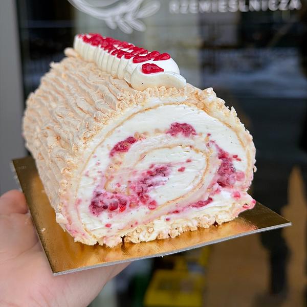 delikatna rolada bezowa, krem na bazie mascarpone z wanilią, konfitura malinowa, świeże maliny